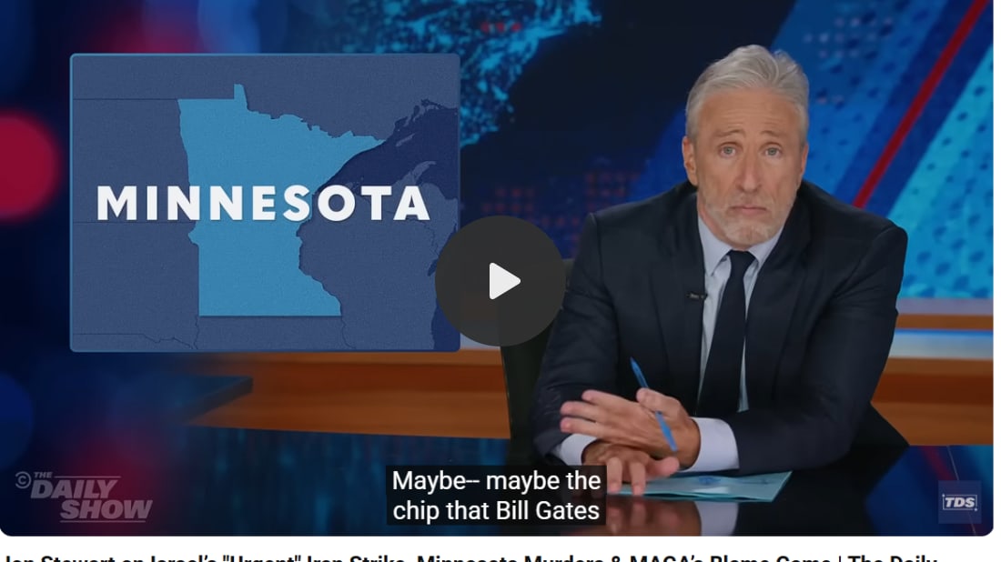 June 18, 2025: In a 27-minute profanity laced monologue about Israel, Trump's deployment of the National Guard and Marines to the Los Angeles riots, and the targeted murder of Minnesota lawmakers Representative Melissa Hortman and Senator John Hoffman, Jon Stewart offered a few ways to prevent individuals from committing violent crimes. Amongst increasing mental health funding and funding illegal weapons interdiction, Jon Stewart also mentioned a potential way to "Take people out before they do this s#&$*!"(referring to the Minesota murders). Take a listen to this 30-second clip. "Maybe the chip that Bill Gates had injected in all of us during COVID, could have a self-destruct button. Take people out before they do this s#&$*! For God's sake, can't we do that?!" - Jon Stewart, June 16, 2025 "Maybe the Chip that Bill Gates Had Injected in All of Us During COVID?"In my opinion, Jon Stewart appeared very uncomfortable when he delivered the line, "the chip that Bill Gates had injected in all of us during COVID." He stuttered for about 10 seconds and looked off camera before delivering the bit about mass biological surveillance and 'taking people out' before they commit crimes. Prior to delivering that bit, he went 'off-script' and took a 1-minute 'intermission' where he took a bite of a sandwich and a sip of liquor, genuinely seemingly to try and stall or muster up courage. I think it's safe to safe the COVID-19 injectable nanotechnology story is out of the bag now that Jon Stewart mentioned Bill Gates' COVID-19 injectable computer chips in his opening Monday night monologue. Died Suddenly 2: NanoSapiensCheck-out the trailer for Died Suddenly 2: Nanosapiens for more information on the biodigital surveillance system being built with injectable nanotechnology. Died Suddenly News Daniel 2:42-43As the toes were partly iron and partly clay, so this kingdom will be partly strong and partly brittle. And just as you saw the iron mixed with baked clay, so the people will be a mixture and will not remain united, any more than iron mixes with clay. |
