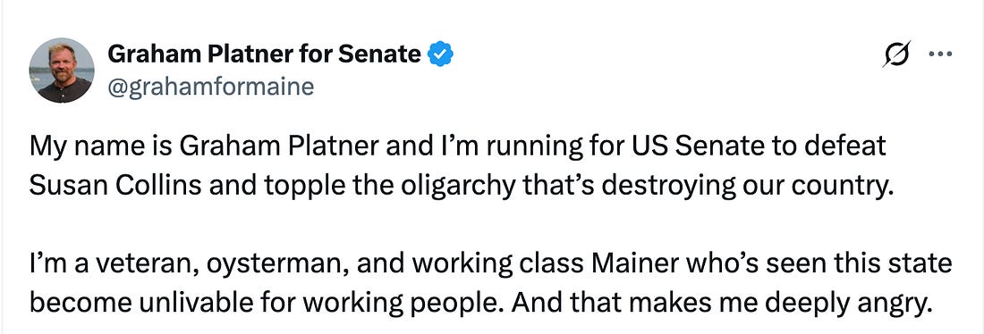 The Great Leftist Ignorance ScamThe new left movement in America is taking off mostly with the very wealthy, which isn't an accidentI almost died laughing when I read that Graham Platner, the "progressive warrior poet" running for Senate in Maine, went to school at Hotchkiss, one of a handful of prep schools in the Northeast more precious and exclusive than my own Concord Academy. The original comic appeal of the Platner story was in watching the legacy press mouthpieces who denounced Pete Hegseth's "Crusader Cross" pec-tattoo rally to the defense of Platner's Nazi Death's Head tat, which he got in Split, Croatia, while he was so wasted. That's been hilarious, but the Free Beacon story about the "warrior poet" with accidental Nazi ink who went to a $75,000 high school describes a political scam of chef's kiss perfection. He fooled even me, and I basically am Graham Platner: a northeasterner of means who went to high school with sons and daughters of rock stars and CIA chiefs, but also has a few Oyster-shucking scars. It would never have occurred to me to market myself as "working class," but Platner obviously doesn't suffer pangs of conscience on that score, describing himself in a launch video as a "working-class Mainer" who can stand a post and chop his own goddamned firewood: Even more incredible is how far and wide the humble origins tag has flown, with everyone from The New Yorker to the Washington Post to Bernie Sanders and Politico selling him as a "candidate from the working class" taking on the big, bad establishment. It should have been a major red flag that even Bon Appétit ran a gullible feature on Platner's journey from "working class fisherman to Maine's Zohran Mamdani," but I still didn't catch it, underestimating the sheer stones behind this marketing gambit: Platner will do well, since his glass-chewing voice and military chops will provide enough on-camera verisimilitude for voters to forgive his salesmanship indiscretions. He'll be forgiven, unlike Gavin Newsom, already being savaged for his recent effort to rebrand himself as an ex-street waif forced to live off crusts of Wonder Bread. It's all hilarious until you read other parts of the Platner story, which include hanging out on a Socialist reddit under the name "P-Hustle," describing himself as a communist and "antifa super-soldier," and suggesting violence is necessary for social change. An old Bangor Daily News editorial he wrote contained the following passage: